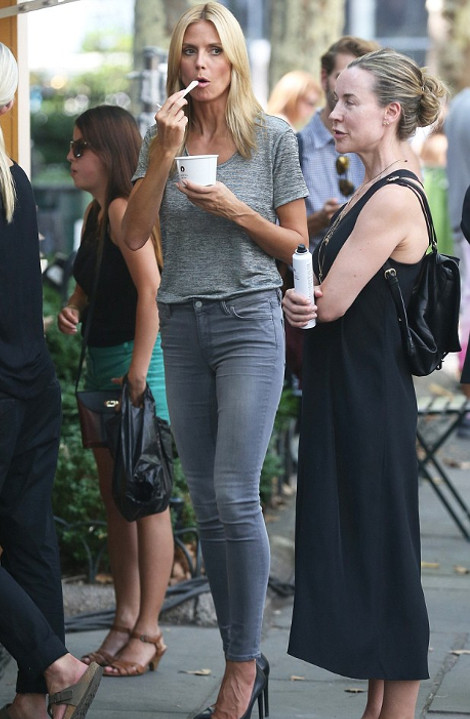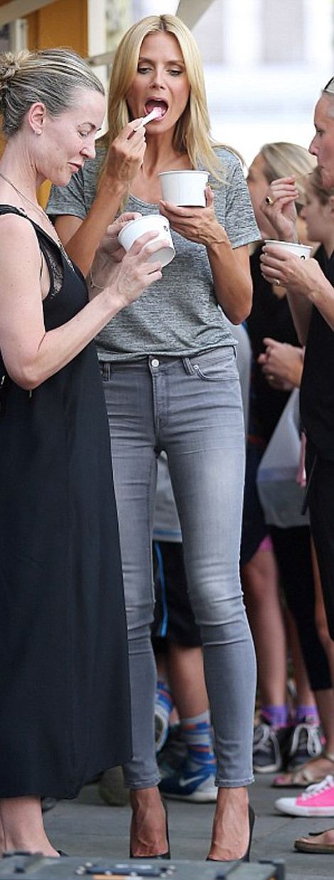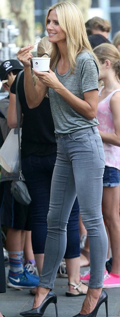Ντυμένη απλά, με ένα γκρι στενό τζιν, ένα μπλουζάκι και μαύρες ψηλοτάκουνες γόβες η Χάιντι Κλουμ απόλαυσε χωρίς καμία ενοχή το παγωτό της κλείνοντας το μάτι στους παπαράτσι που ήξερε που ζουμάρουν.