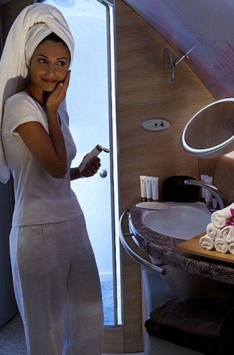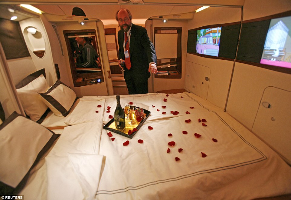 Και φυσικά οι συγκεκριμένοι τυχεροί δεν είναι εγκλωβισμένοι σε ένα στενό κάθισμα, αλλά μπορούν να κοιμηθούν σε άνετα κρεβάτια, να φρεσκαριστούν κάνοντας ένα μπάνιο, να δουν τηλεόραση, να δουλέψουν κατά τη διάρκεια της πτήσης και φυσικά να γευτούν υψηλές γεύσεις που περιλαμβάνουν χαβιάρι, σαμπάνια, τροπικά φρούτα και εκλεκτά εδέσματα.
