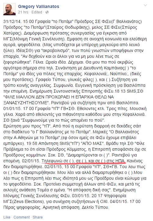 02/01/15. Τηλεφωνώ σε ( ), σε ( ), και σε ( ) στις ΗΠΑ. Κανένας δεν διαμαρτυρήθηκε. 02/01/15, 15.00 Γραφεία «τΠ», Σταύρος Θεοδωράκης + Γρηγόρης Βαλλιανάτος. Του λεω πως οι ( ) δεν διαμαρτυρήθηκαν. Μου λέει ναι αλλά διαμαρτυρήθηκε ο ( ). Μου λέει πως η Επιτροπή λέει πως ιδιότητά μου ως Προέδρου είναι κώλυμα για το ψηφοδέλτιο. Σοκ. Προτείνει συμμετοχή άλλων από ΦιΣυ, και μετά τις εκλογές ανάθεση Τομέα σ εμένα. «Η απόφαση δική σας». Ενημέρωση Μόνιμης Γενικής Συνέλευσης