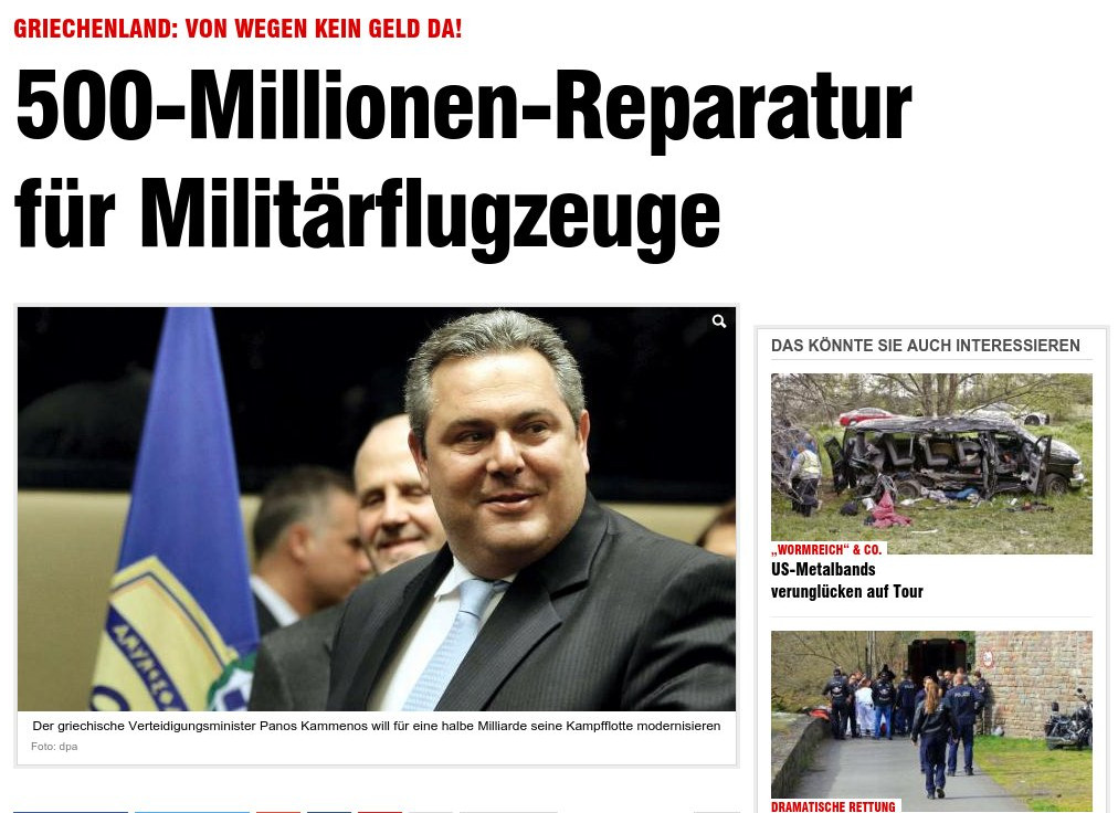 Η γερμανική εφημερίδα αναφέρει τα γεγονότα της απευθείας ανάθεσης και τονίζει πως ο... Ελληνας πρωθυπουργός και ο υπουργός Αμυνας στις 15 Μαρτίου έδωσαν εκατομμύρια για να επισκευάσουν στα επόμενα χρόνια πολεμικά αεροπλάνα.