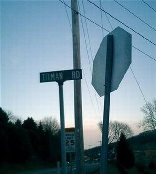 Ονόματα δρόμων για γέλια Κι όμως υπάρχουν!Περιττώματα (σικ) αγελάδαςΑπό Εδώ, Από ΕκείΑπροσδόκητοΦοβερόςΛωρίδα Ηλίθιας ΓυναίκαςΤρύπα Πισινού (σικ)ΕκσπερμάτισηΣτηθάντραςΔιαζύγιοΠαρθένο πηγη