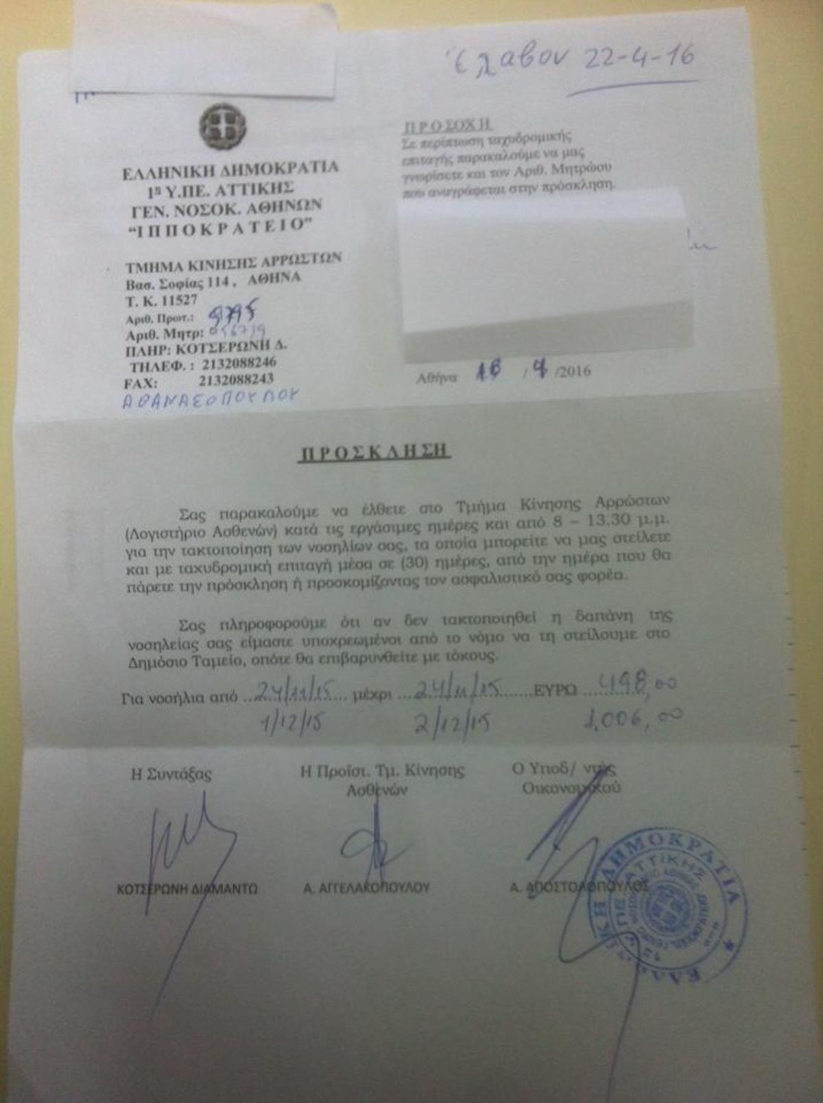 Κάποια δημόσια νοσοκομεία συνεχίζουν να στέλνουν σημειώματα σε ανασφάλιστους ασθενείς ζητώντας με αυτόν τον παράνομο πια τρόπο να πληρώσουν το υποτιθέμενο χρέος που προέκυψε από τη νοσηλεία τους… Το έγγραφο που αποδεικνύει την ανευθυνότητα κάποιων έδωσε στην δημοσιότητα το ΚΕΦΙ και δημοσιεύουμε παρακάτω...