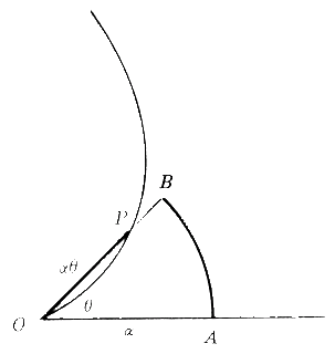 9.4 Με τον έλικα του Αρχιμήδη μπορούμε να δώσουμε μια έξυπνη λύση στο πρόβλημα του τετραγωνισμού (δηλαδή στο πρόβλημα της κατασκευής ενός τετραγώνου που να έχει εμβαδόν ίσο με αυτό ενός δεδομένου κύκλου)· από ό,τι γνωρίζουμε ο Αρχιμήδης χρησιμοποίησε πράγματι τον έλικά του γι ‘ αυτόν το σκοπό. Με δυναμικούς όρους, μπορούμε να ορίσουμε τον έλικα ως το γεωμετρικό τόπο ενός σημείου P που κινείται με σταθερή ταχύτητα πάνω σε μια αχτίνα, η οποία με τη σειρά της περιστρέφεται με σταθερή επίσης ταχύτητα πάνω σ’ ένα επίπεδο γύρω από την αρχή της. Αν πάρουμε σαν θέση αναφοράς τη θέση Ο Α της περιστρεφόμενης αχτίνας όταν το P ταυτίζεται με την αρχή Ο της ακτίνας, τότε το ΟΡ είναι ανάλογο με τη γωνία ΑΟΡ και η πολική εξίσωση του έλικα είναι p = αθ, όπου α η σταθερά αναλογίας.