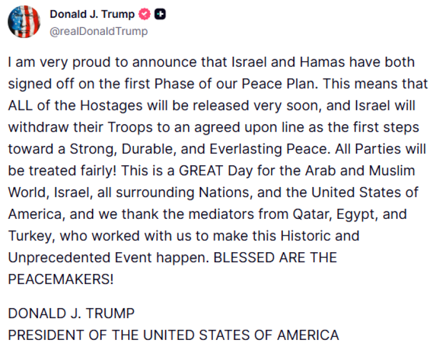 «Αυτό σημαίνει ότι ΟΛΟΙ οι όμηροι θα απελευθερωθούν πολύ σύντομα και το Ισραήλ θα αποσύρει τα στρατεύματά του σε μια συμφωνημένη γραμμή ως τα πρώτα βήματα προς μια Ισχυρή, Διαρκή και Αιώνια Ειρήνη», δημοσιεύει ο Τραμπ στο Truth Social.