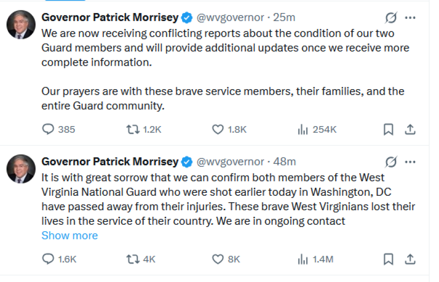 Οι δύο στρατιώτες ανήκουν στην Εθνοφρουρά της Δυτικής Βιρτζίνια, όπως ανέφερε ο κυβερνήτης της Πολιτείας, Πάτρικ Μόρισεϊ. Σε ανάρτησή του αρχικά είχε γράψει ότι είναι νεκροί, αλλά σε νεότερη ανάρτηση, 23 λεπτά αργότερα, μίλησε για «αντικρουόμενες αναφορές» για την κατάστασή τους.