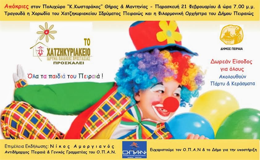 Το Χατζηκυριάκειο Ίδρυμα Παιδικής Προστασίας Πειραιά σας προσκαλεί στην αποκριάτικη συναυλία στον Πολυχώρο Καμινίων "Κ.Κωσταράκος", την Παρασκευή 21 Φεβρουαρίου 2014 και ώρα 19.00.