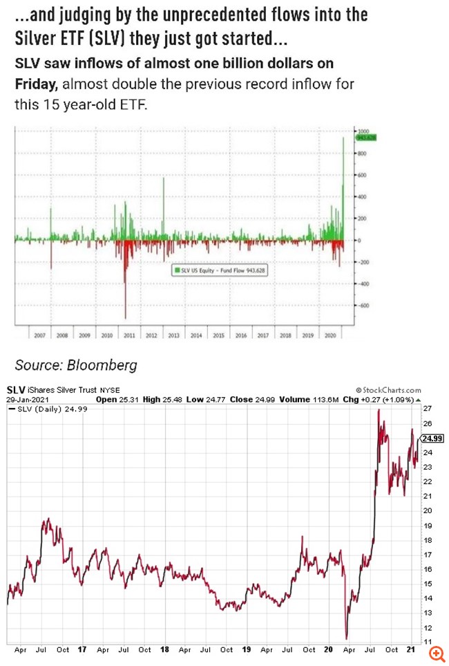 Μετά την εκτόξευση της Gamestop (GME) και των λοιπών κερδοσκοπικών χαρτιών την Παρασκευή που πέρασε, στο στόχαστρο φαίνεται πως βρέθηκε το ασήμι. Στο ETF SLV την Παρασκευή εισέρευσαν περί το 1 δισ. δολ., ποσό διπλάσιο από το 15ετές ρεκόρ των υψηλότερων εισροών.