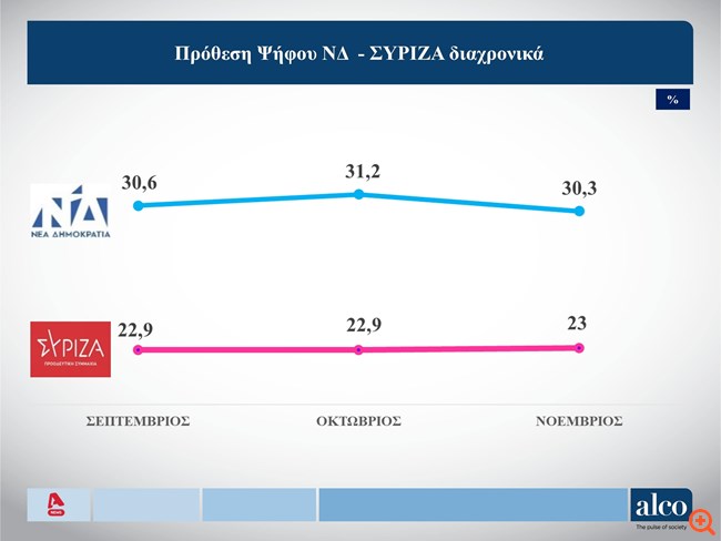 Προβάδισμα 7,3 μονάδων ( από 8,3 τον Οκτώβριο) διατηρεί η Νέα Δημοκρατία έναντι του ΣΥΡΙΖΑ στην πρόθεση ψήφου σύμφωνα με την τελευταία δημοσκόπηση της Alco για λογαριασμό του Alpha, η οποία παρουσιάστηκε στο κεντρικό δελτίο ειδήσεων του καναλιού.